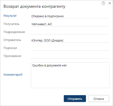 *Результат. Из выпадающего списка выберите значение Отказано в подписании;