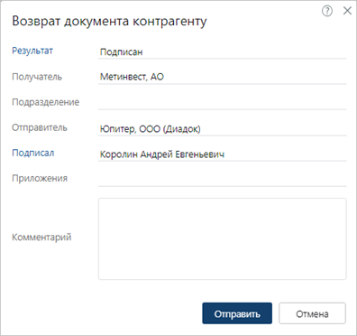 4.В открывшемся окне возврата заполните поле *Результат значением Подписан. Убедитесь, что остальные поля заполнены данными из карточки аннулируемого документа: