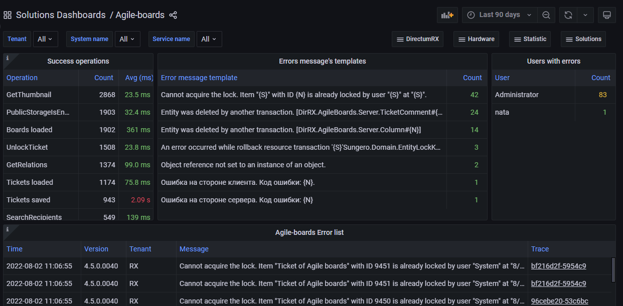 На панелях дашборда отображается информация об обработке объектов. Также выводится информация об ошибках, возникающих в Agile-досках, а также обо всех ошибках сервисов, связанных с решением.