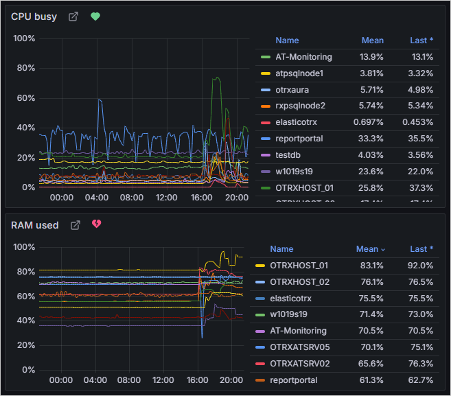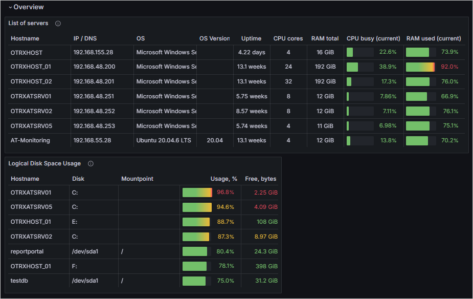 Для выбранных серверов на домашней странице отображается загрузка процессора (CPU busy) и использование оперативной памяти (RAM used):