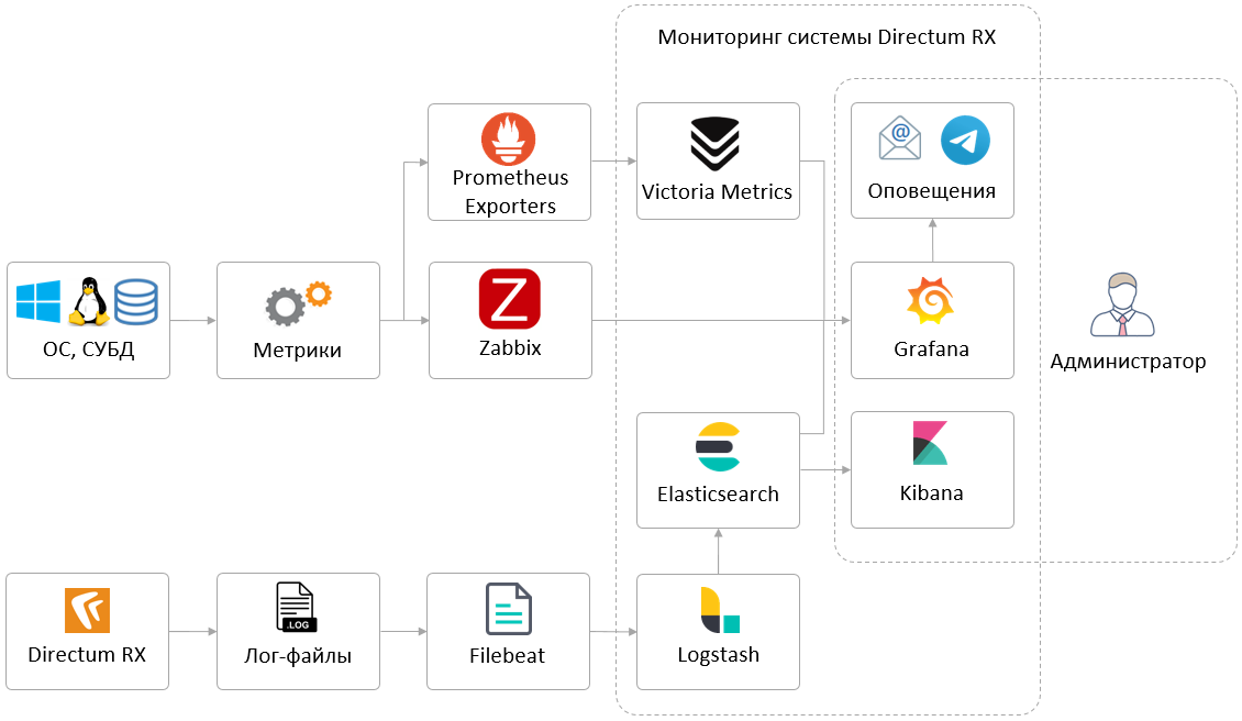 •Prometheus Exporters и Zabbix снимают значения счетчиков производительности с ОС на серверах, на которых установлена СУБД и сервисы Directum RX;