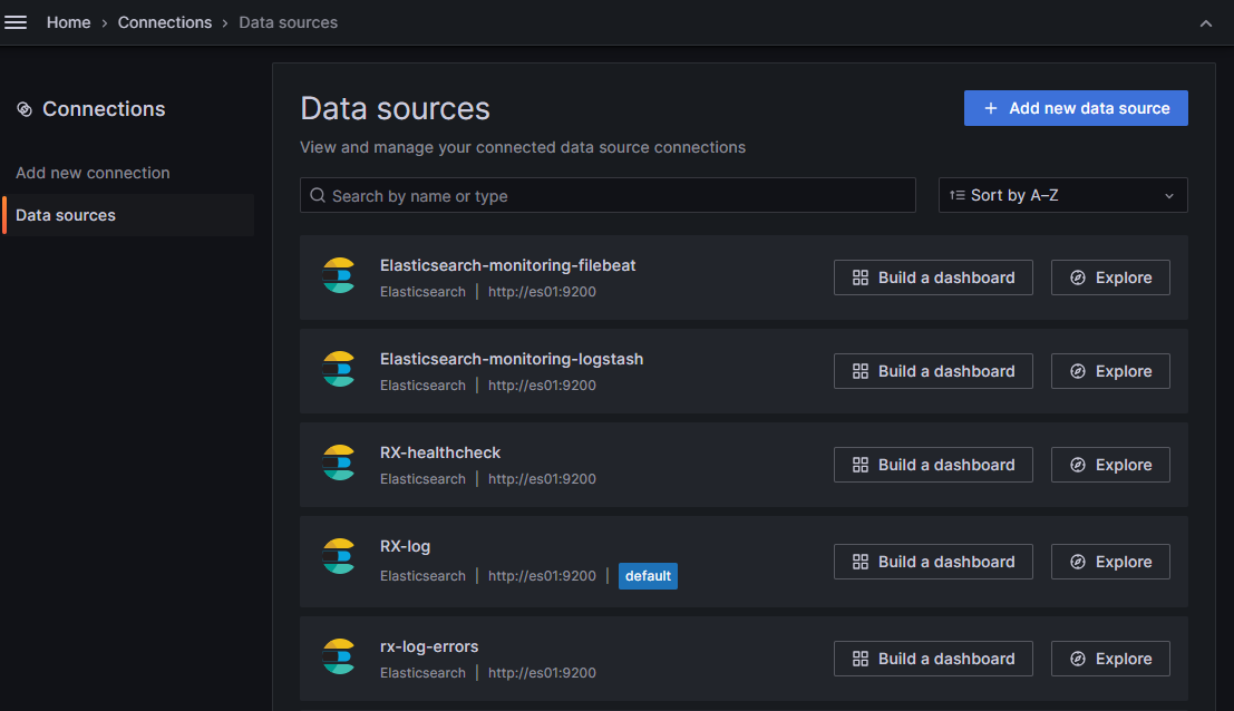 Для работы с источниками данных на сайте Grafana в меню Connections выберите пункт Data sources. Откроется список всех источников данных: