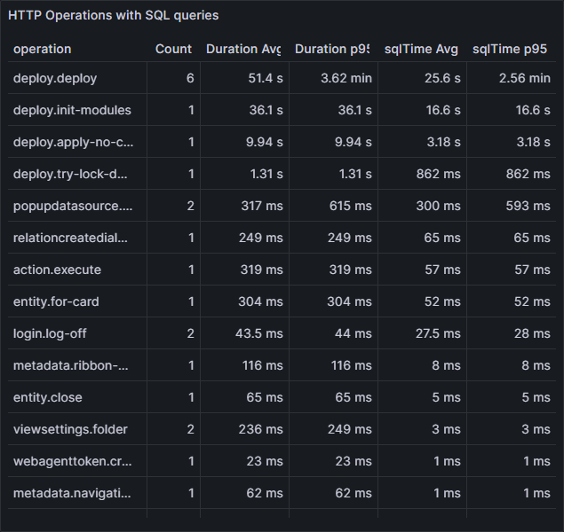 •sqlTime p95 – максимальная длительность SQL-запросов миллисекундах. Отображается максимальное время выполнения операции для 95% операций. 5% максимальных значений отсекаются как статистическая погрешность.