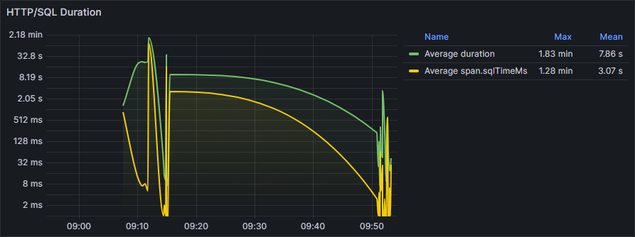 На панели HTTP/SQL Duration наглядно отображается разница между общей длительностью HTTP-запросов (Average duration) и временем SQL-запросов (Average span.sqlTimeMs):