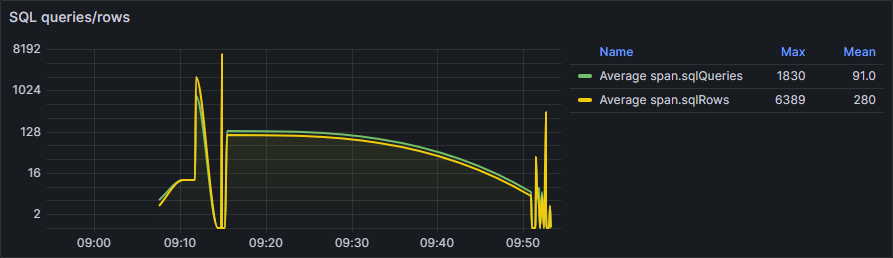 На панели SQL queries/rows можно отследить статистику запросов (Average span.sqlQueries) к СУБД и ответов от нее (Average span.sqlRows):
