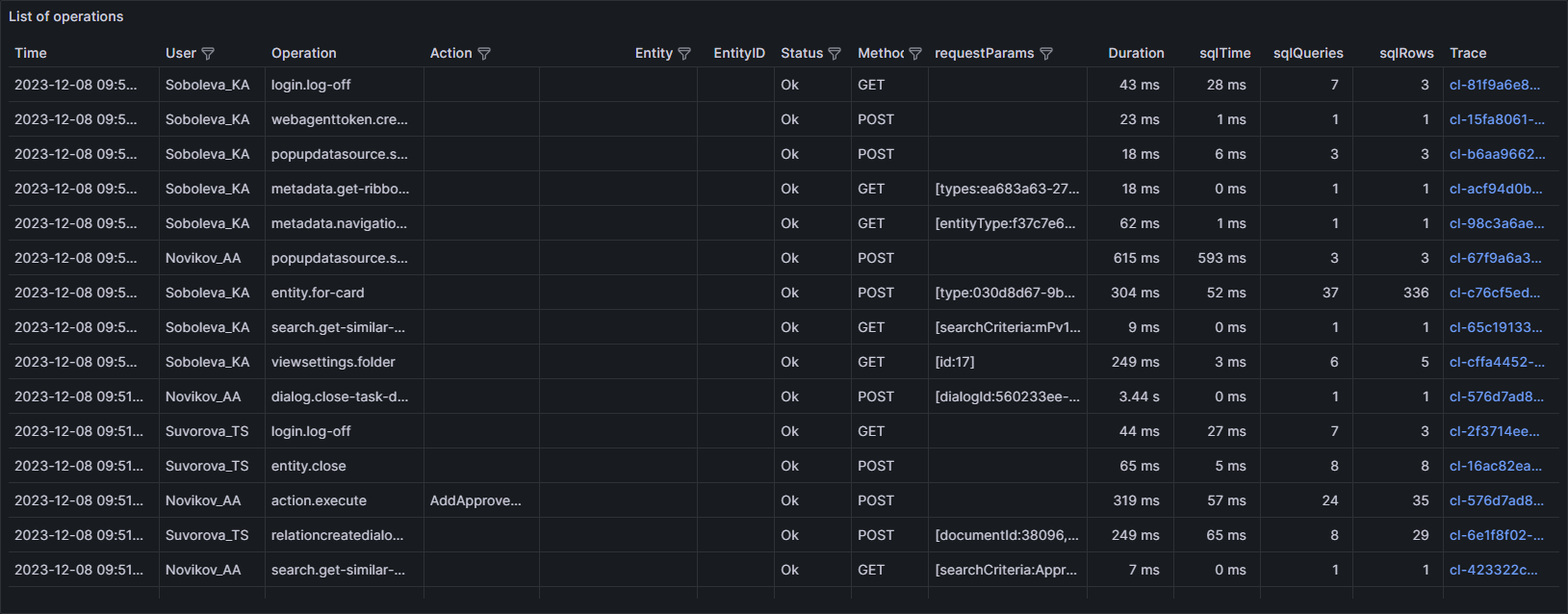 •Trace – ссылка на трассу, по которой можно перейти на дашборд Detailed Information by traceID и проанализировать операцию.