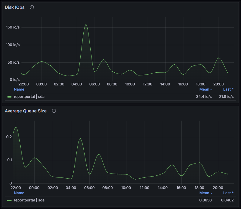 В примере видны пики по средней очереди и числу обращений к диску: