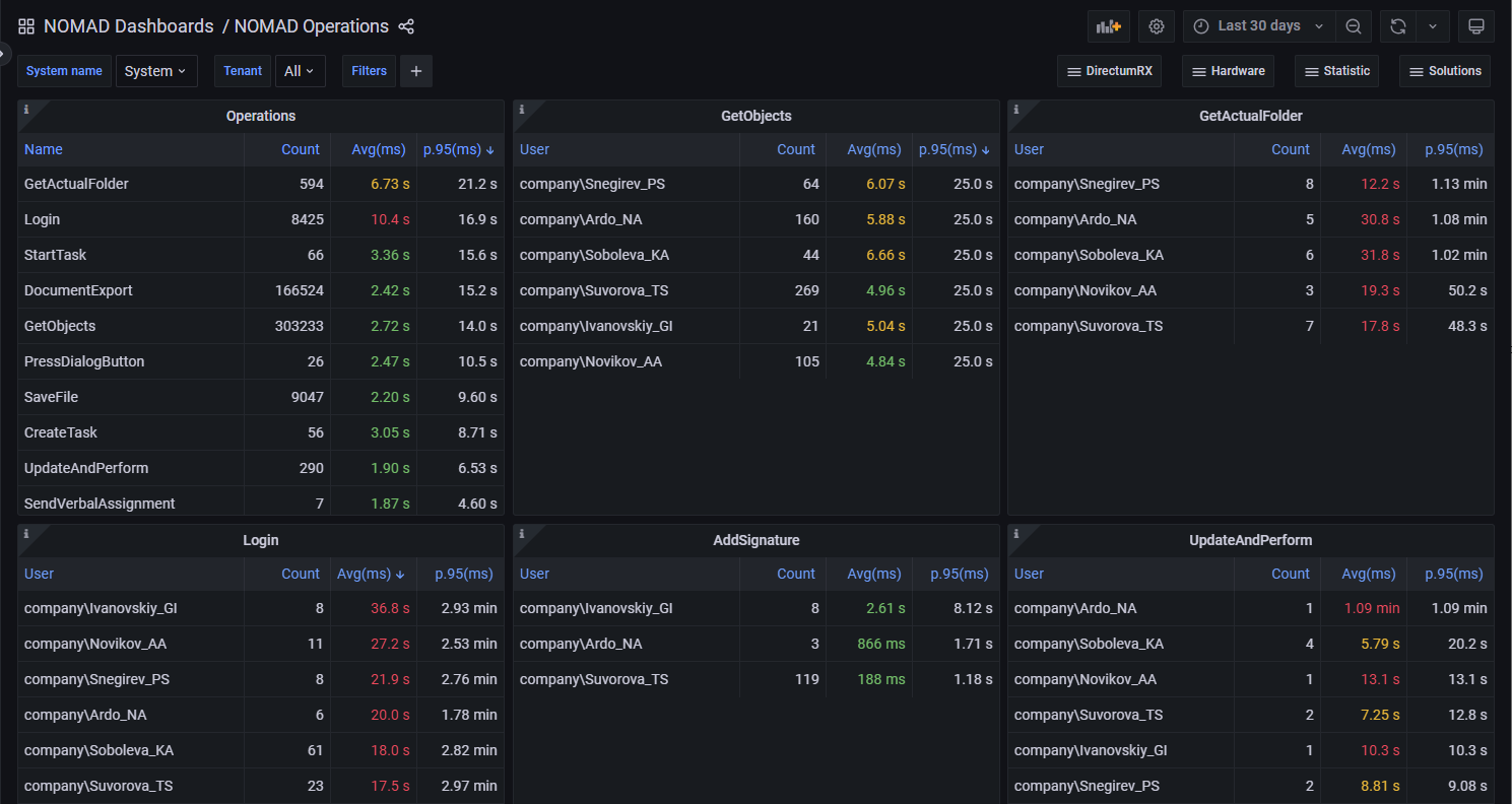 Когда сотрудник работает с системой Directum RX через Directum Solo и Directum Jazz, мобильные приложения отправляют в сервис NOMAD запросы. Например, при авторизации, загрузке данных, подписании документа и т.д. Статистика выполнения этих запросов отображается на дашборде NOMAD Operations.