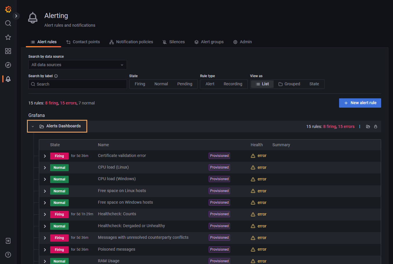 Чтобы перейти к списку всех оповещений, в меню Alerting перейдите на вкладку «Alert rules» и нажмите на раскрывающийся список Alerts Dashboards: