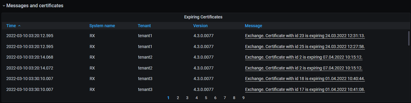 В группе отображаются предупреждения о завершении срока действия сертификатов, информация о сообщениях из сервисов обмена и ошибках за определенный день.