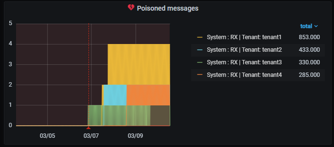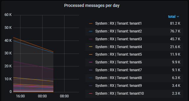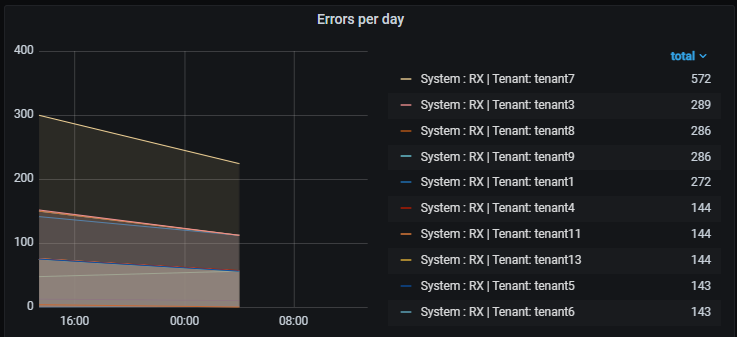 График на панели Errors per day показывает количество ошибок в разрезе тенантов. По количеству ошибок можно понять, на каком тенанте их больше всего. Это поможет администратору расставить приоритеты, где исправлять ошибки в первую очередь.