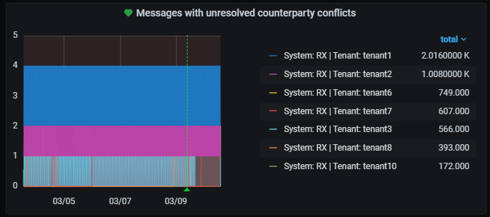 С помощью панели Processed messages per day можно оценить загруженность системы Directum RX. Если ежедневная загрузка высокая, то документы от контрагента могут задерживаться. Если загрузки совсем нет, то возможно документы вообще не приходят, и нужно искать причину.
