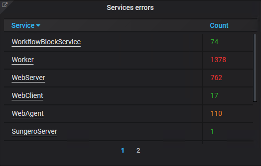 На домашней странице на панели Services errors отображается суммарное количество критичных и неизвестных ошибок в разрезе сервисов Directum RX. В зависимости от количества ошибок, значения в колонке Count окрашивается в зеленый, оранжевый или красный цвет: