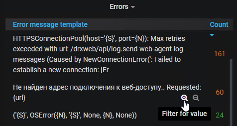 Чтобы посмотреть информацию по конкретной ошибке, на панели Errors наведите курсор на текст интересующей ошибки и во всплывающем фильтре выберите Filter for value. В результате отфильтруются данные на всех панелях.