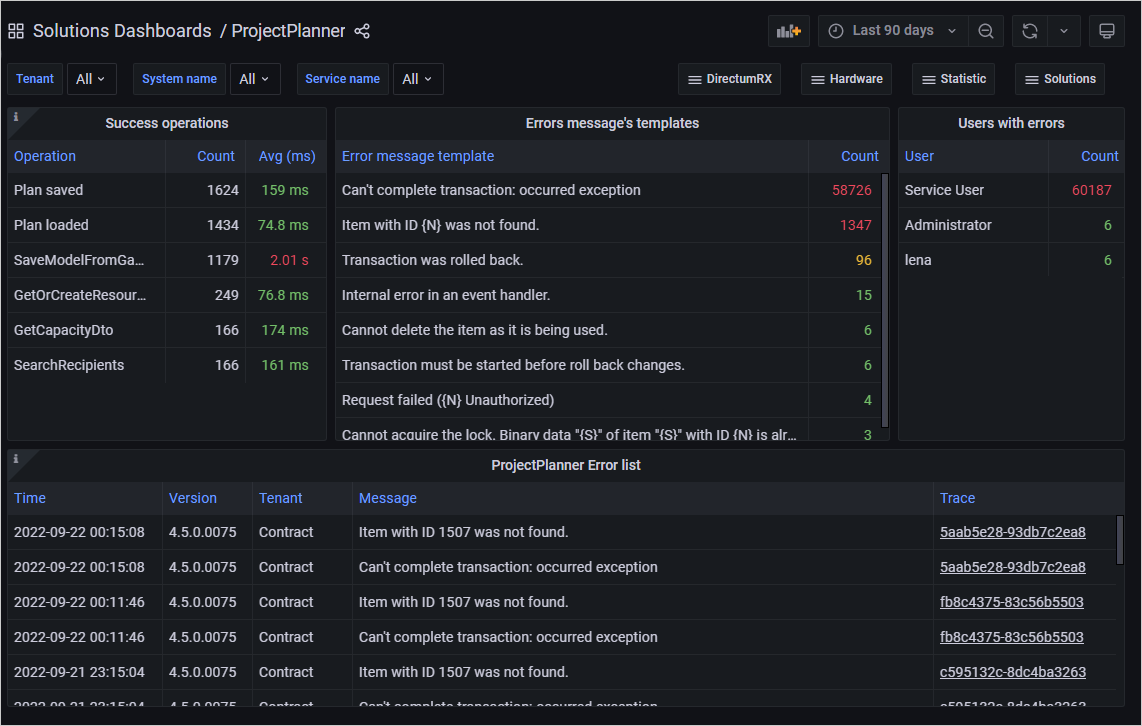 На панелях дашборда отображаются данные об обработке планов проектов. Также выводится информация об ошибках, возникающих в решении и обо всех связанных с ним ошибках сервисов.