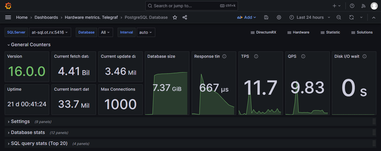 Для отслеживания состояния СУБД панели дашборда сгруппированы по категориям: