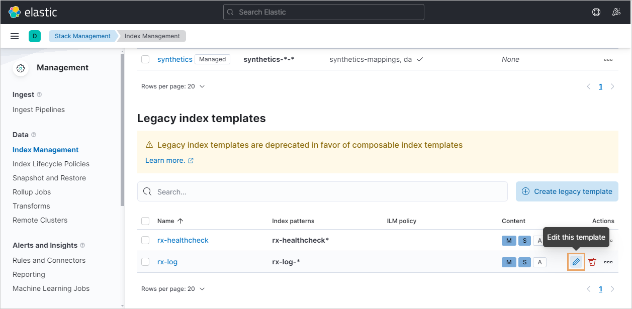 1.На странице Kibana перейдите в раздел Stack Management – Index Management – Index Templates – Legacy index templates и в нужном шаблоне нажмите на кнопку Edit this template: