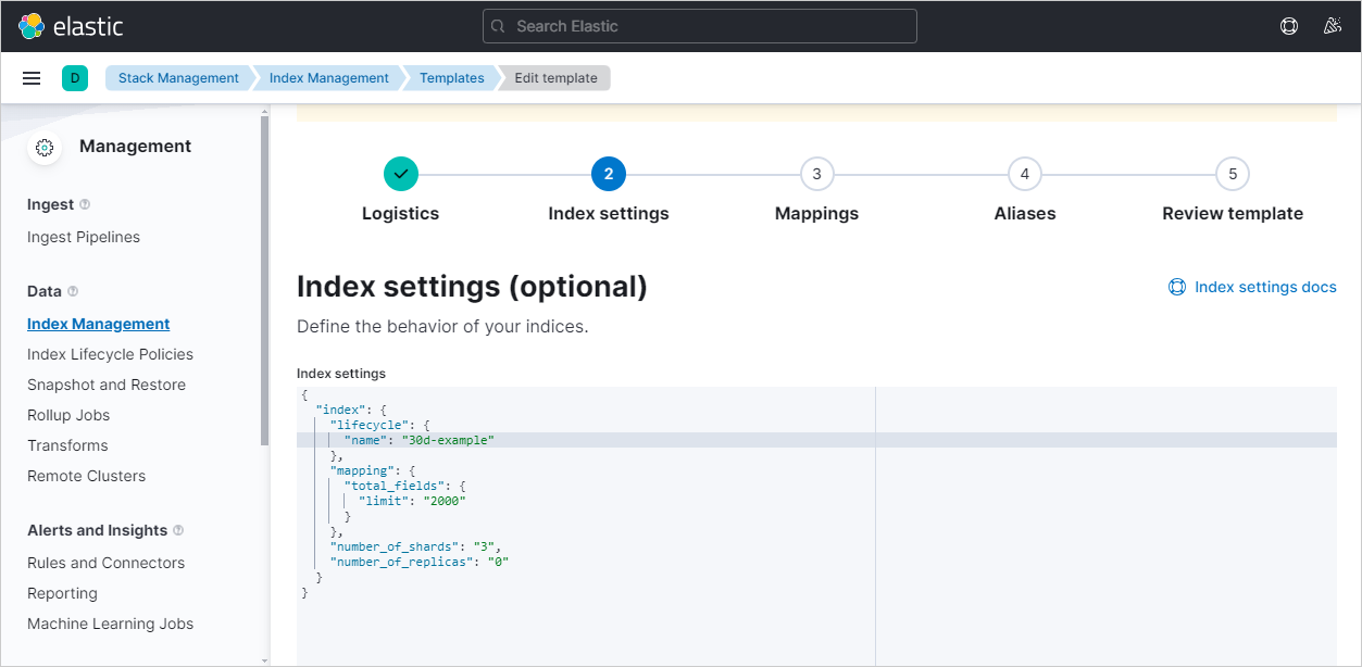 2.В редакторе шаблона перейдите на вкладку Index settings и добавьте свойство lifecycle. В нем укажите имя политики 30d-example: