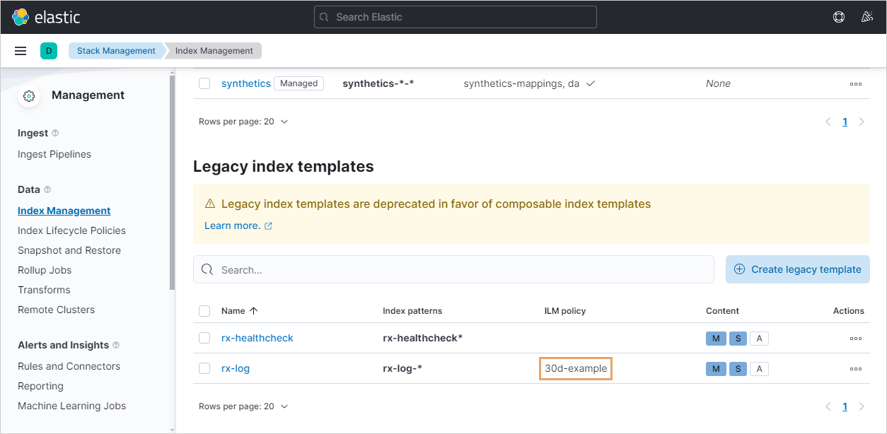 4.Чтобы проверить, применилась ли политика, перейдите в раздел Stack Management – Index Management – Index Templates – Legacy index templates и найдите ее в общем списке шаблонов: