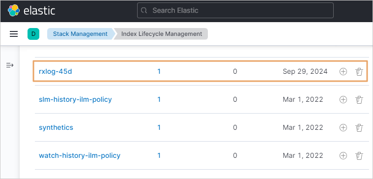 1.На странице Kibana перейдите в раздел Stack Management – Index Lifecycle Management и у созданной политики нажмите на кнопку