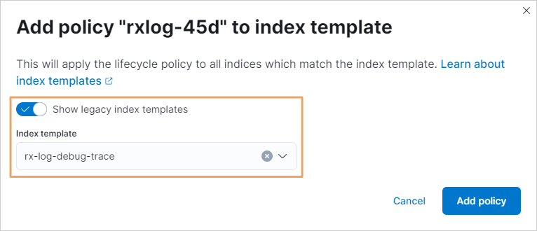 2.В появившемся окне измените положение переключателя Show legacy index template и в выпадающем списке Index template выберите шаблон, к которому нужно применить политику: