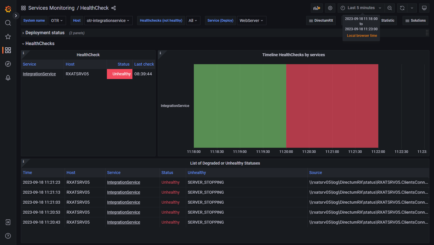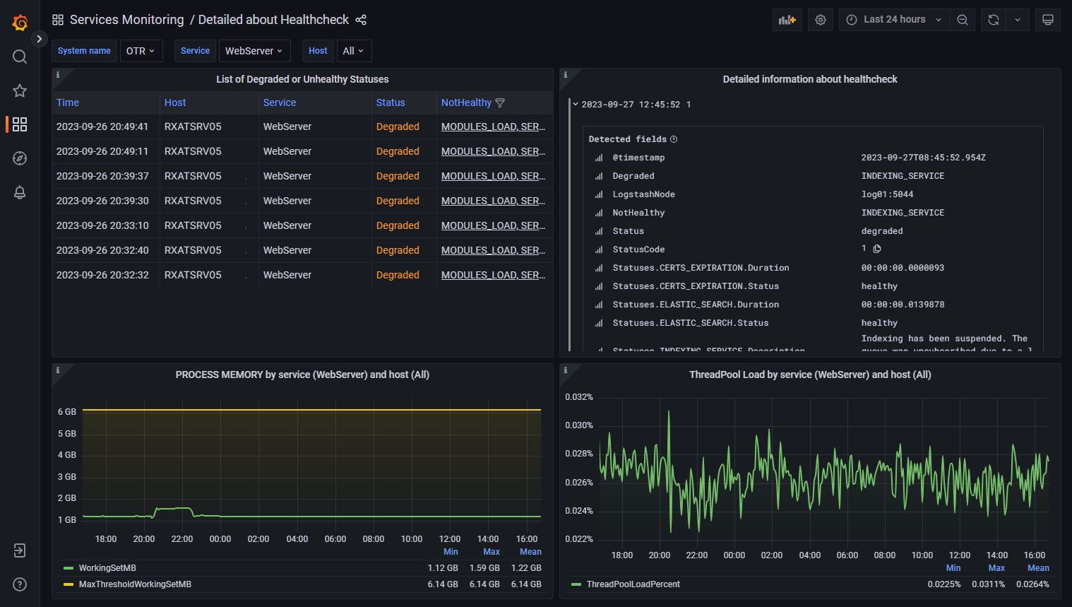 Подробная информация о проверках работоспособности, которые выявили проблему или критичную ошибку, отображается на дашборде Detailed about Healthcheck. Его можно открыть по ссылкам в столбце Service на панелях HealthCheck и List of Degraded or Unhealthy Statuses и по кнопке