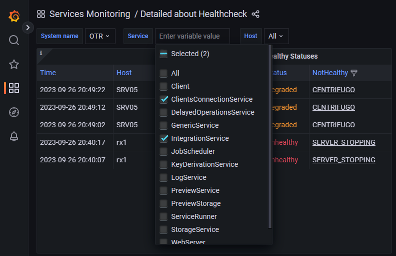 По умолчанию на дашборде отображаются данные всех сервисов и хостов. При необходимости в выпадающих списках Service и Host можно выбрать одно или несколько значений: