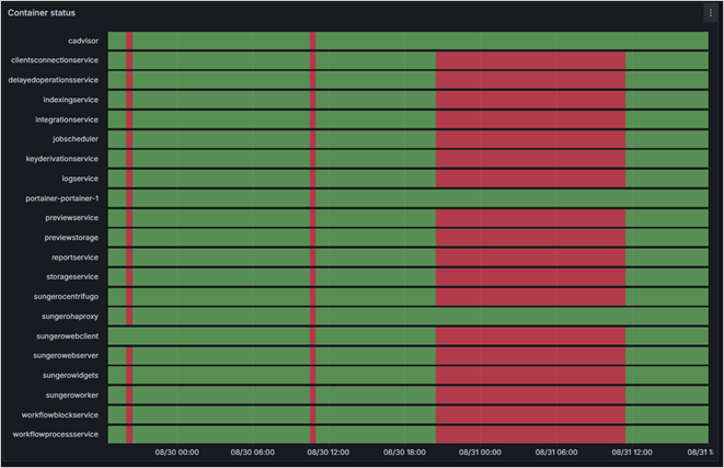 Пример 2. Панель Container status показывает, что контейнеры сервисов не работали в промежутки времени, выделенные красным: