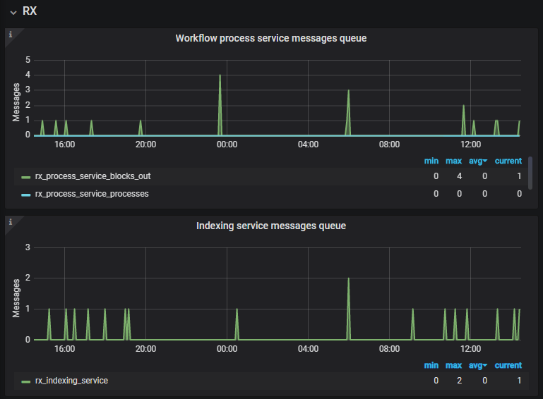 В группе RX отображается количество сообщений в очередях Directum RX, сгруппированные по сервисам и операциям. Например, можно посмотреть количество сообщений в очереди Workflow, сервиса предпросмотра или сервиса индексирования. При возникновении проблем или сбоев количество сообщений постоянно растет.