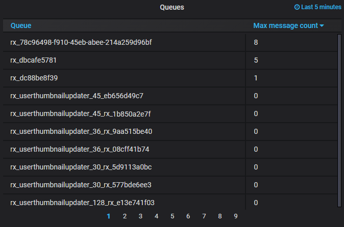 На панели Queues отображается максимальное количество сообщений за последние пять минут в разрезе очередей.