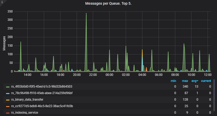 На панели Messages per Queue. Top 5 отображается график изменения количества сообщений в очередях с течением времени. В примере видно, что количество сообщений колеблется примерно с одинаковым периодом и амплитудой. Это говорит о том, что очереди успевают обрабатывать сообщения.
