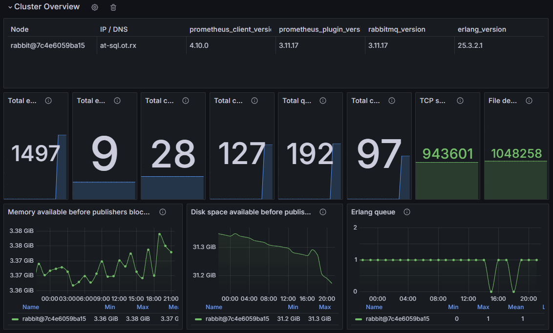 В группе Cluster Overview отображается общая информация об используемом брокере сообщений RabbitMQ: количество очередей, количество соединений, использование памяти и т.д. Информация может быть полезна службе поддержки Directum RX при расследовании инцидентов.