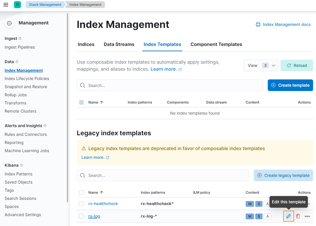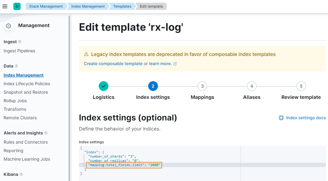 2.На открывшейся странице в консоли выполните команду для увеличения количества полей в индексе rx-log-metrics-2024.01: PUT rx-log-metrics-2024.01/_settings В результате появится сообщение, что изменения применены: «"acknowledged" : true». 3.Чтобы проверить, что все настроено верно, в меню Management выберите раздел Stack Management. На открывшейся странице в меню Data выберите раздел Index Management и в списке нажмите на индекс rx-log-metrics-2024.01. В открывшемся окне перейдите на вкладку «Settings» и проверьте значение параметра total_fields – в нем должен быть указан новый лимит. Чтобы изменить лимит для новых индексов: 1.На странице Kibana в меню Management выберите раздел Stack Management. 2.На открывшейся странице в меню Data выберите раздел Index Management, перейдите на вкладку «Index Templates» и нажмите на кнопку для редактирования шаблона, например rx-log: 3.В открывшемся редакторе перейдите в Index Settings и добавьте параметр mapping.total_fields.limit, указав в нем новый лимит: 4.Перейдите в Review template и нажмите на кнопку Save template. В результате для новых индексов, которые начинаются на «rx-log-*», устанавливается заданный лимит. |