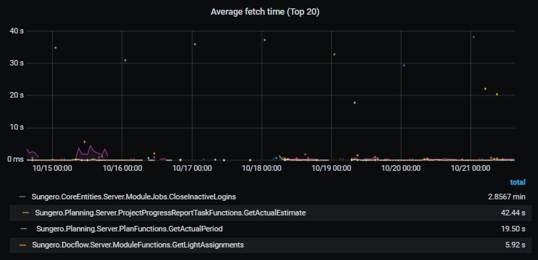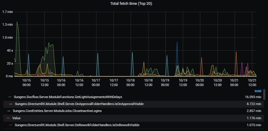 На панели Total fetch time (Top 20) в виде графика отображается, когда был отправлен запрос с большим количеством возвращенных записей и сколько времени сервер его обрабатывал. Это позволяет разработчику отследить наиболее неоптимальные запросы, требующие доработки.