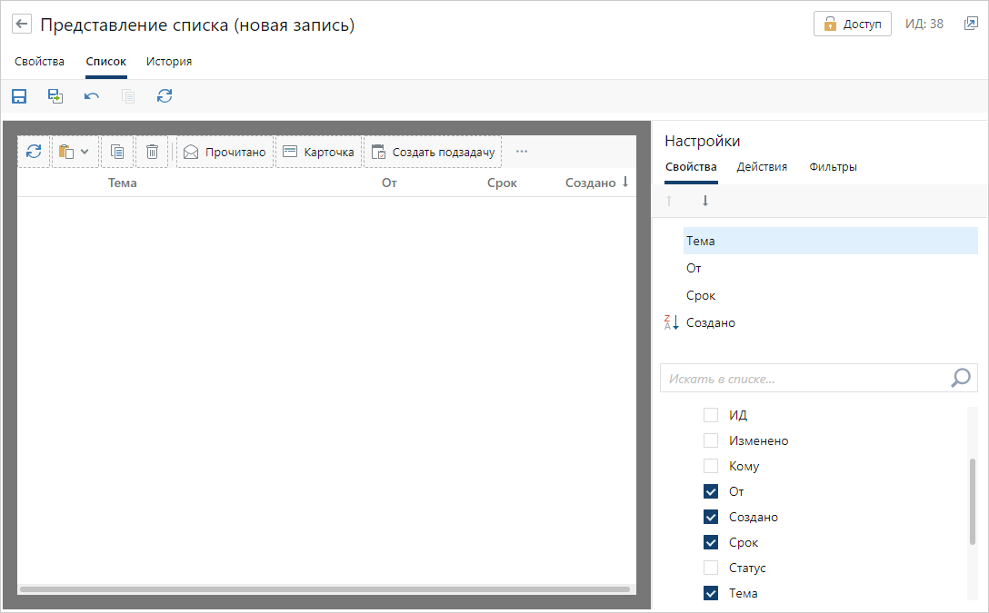 2.Настройте видимые элементы списка, кнопки на панели действий и фильтры.