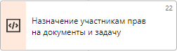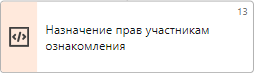 Блок типа «Скрипт». Назначает участникам ознакомления права на просмотр всех добавленных в задачу вложений Права повторно не назначаются: •если у участника есть личные права на документы; •если участник входит в состав группы или роли с доступом к документам. Участнику назначаются права, если он получил доступ к документам по замещению |