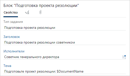 •в поле Тема укажите шаблон темы задания, которая отобразится советнику в списке заданий. Например, «Подготовьте проект резолюции: $DocumentName», где $DocumentName – наименование основного документа, вложенного в задачу на рассмотрение.