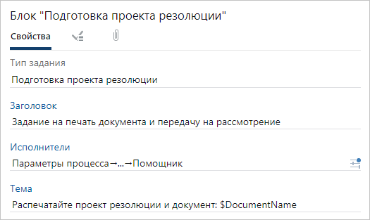 5.Заполните свойства блока «Доработка проекта резолюции помощником»: