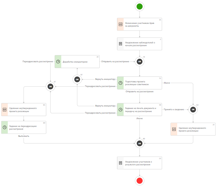 •если советник или помощник директора решают передать документ на рассмотрение другому руководителю, например исполнительному директору, то инициатору приходит задание на переадресацию. Он отправляет документ на рассмотрение другому адресату и выполняет задание. Процесс завершается.