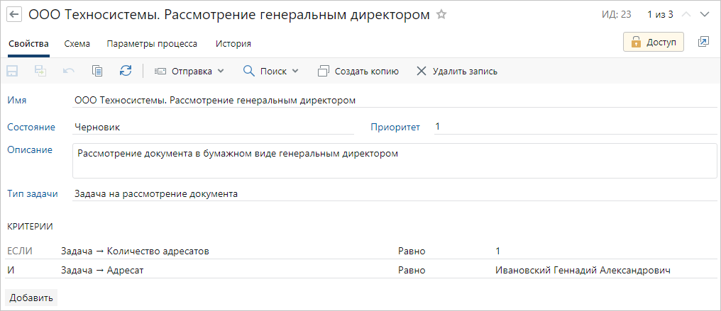 В результате новый вариант процесса станет действующим. Он автоматически выбирается системой в задачах на рассмотрение документа, если документ отправляется только генеральному директору.