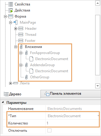 В двух из них (ForApprovalGroup и AddendaGroup) указаны ограничения по типу сущности ElectronicDocument и количеству объектов.