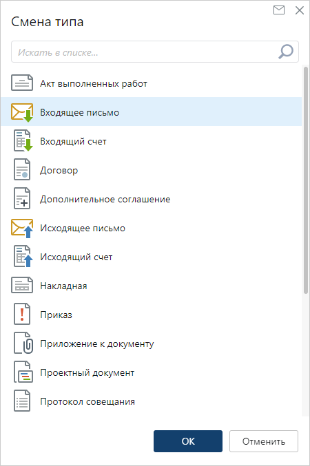 Возникают ситуации, когда необходимо попросить пользователя выбрать какой-либо тип сущности из списка возможных. Например, если при создании документа пользователь некорректно выбрал тип, то при попытке его сменить новый тип выбирается из списка возможных: акт выполненных работ, входящее письмо, входящий счет и т.д.