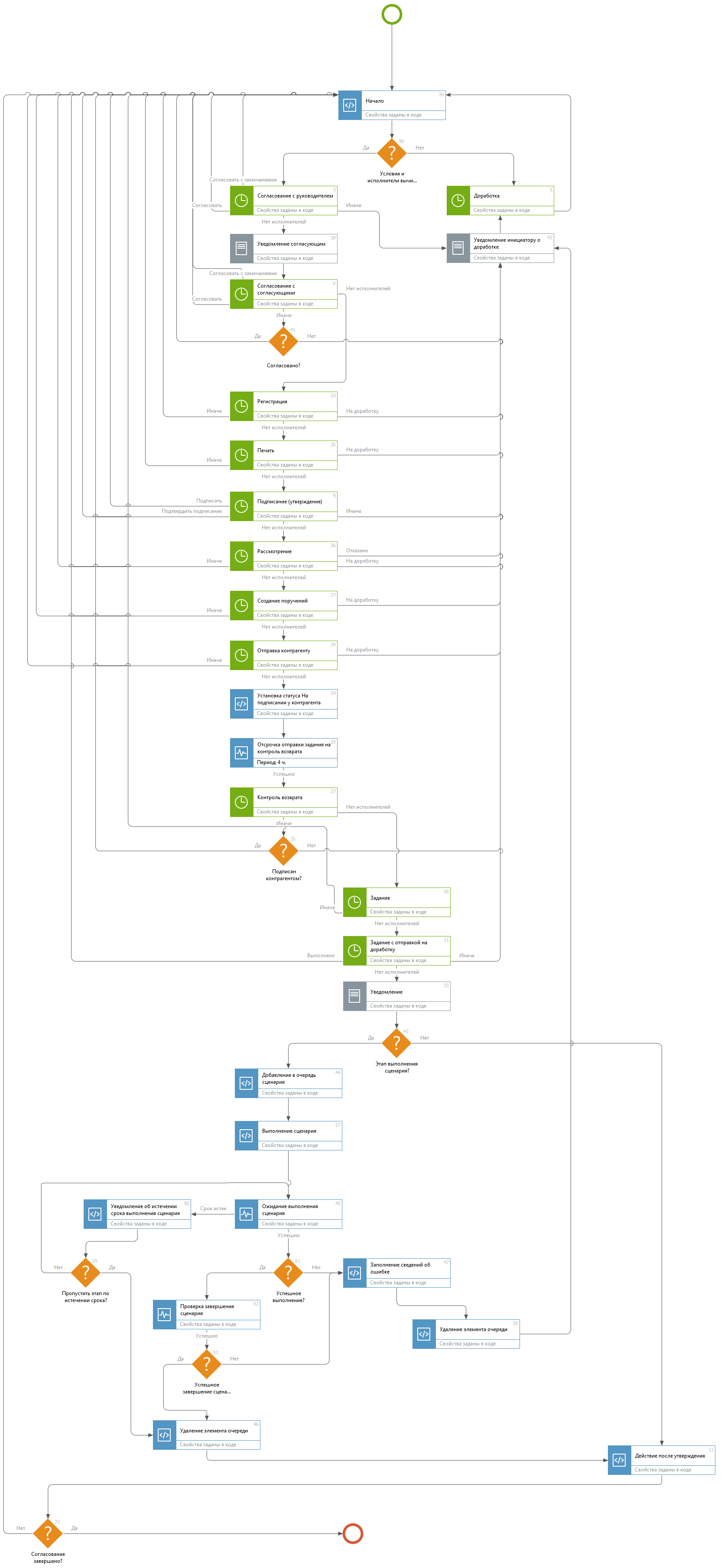 Задача представляет собой мета-процесс, с помощью которого реализуется согласования разных типов документов. Содержит блоки и задания для большинства ситуаций, возникающих при согласовании документа:
