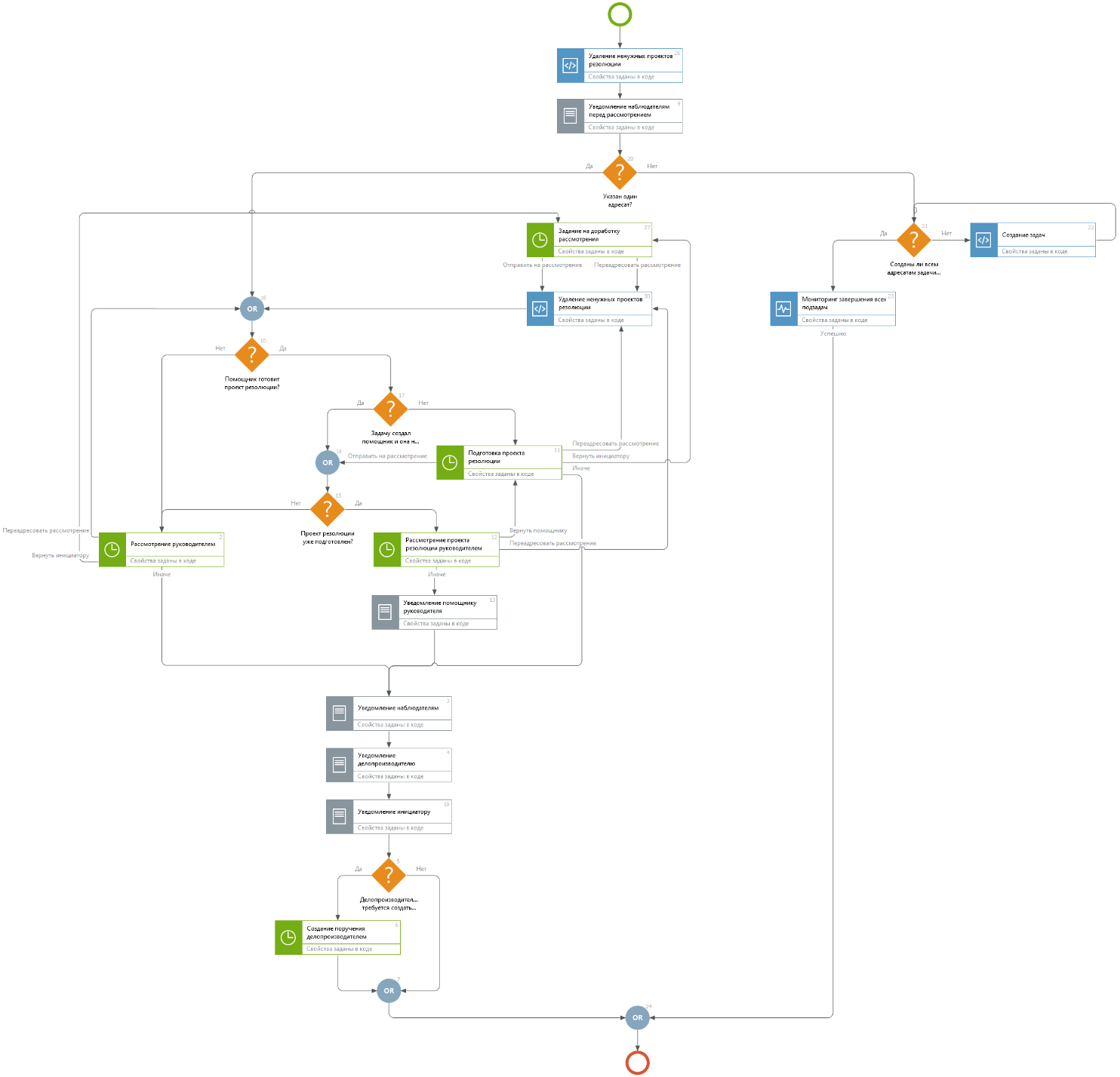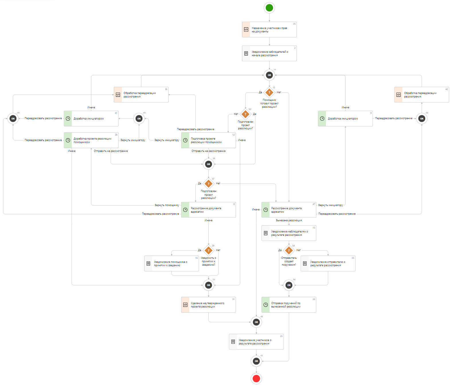 При переадресации рассмотрения схема задачи возвращается в начало, для нового адресата вычисляется помощник и заново определяется необходимость подготовки проекта резолюции.