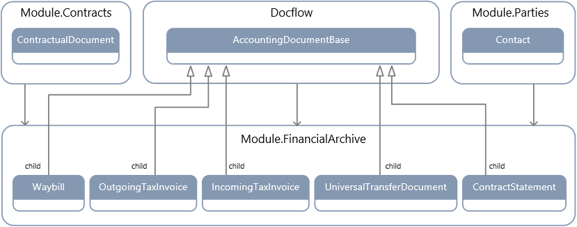 Модуль FinancialArchive (Финансовые документы) реализует хранилище первичных учетных документов и счетов-фактур, а также логику выгрузки документов для проверок. Кроме этого, в модуле реализован импорт формализованных документов в формате xml для интеграции с учетными системами.