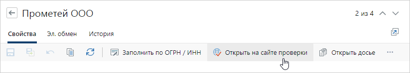 1.В карточке организации на панели действий нажмите на кнопку Открыть на сайте проверки. Откроется страница с подробной информацией о контрагенте.