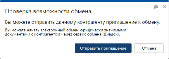 2.Если контрагент зарегистрирован хотя бы в одном сервисе обмена, для которого настроен абонентский ящик нашей организации, то появится сообщение с предложением отправить приглашение: