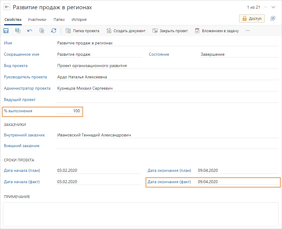 1.В карточке проекта заполните поля % выполнения и Дата окончания (факт):