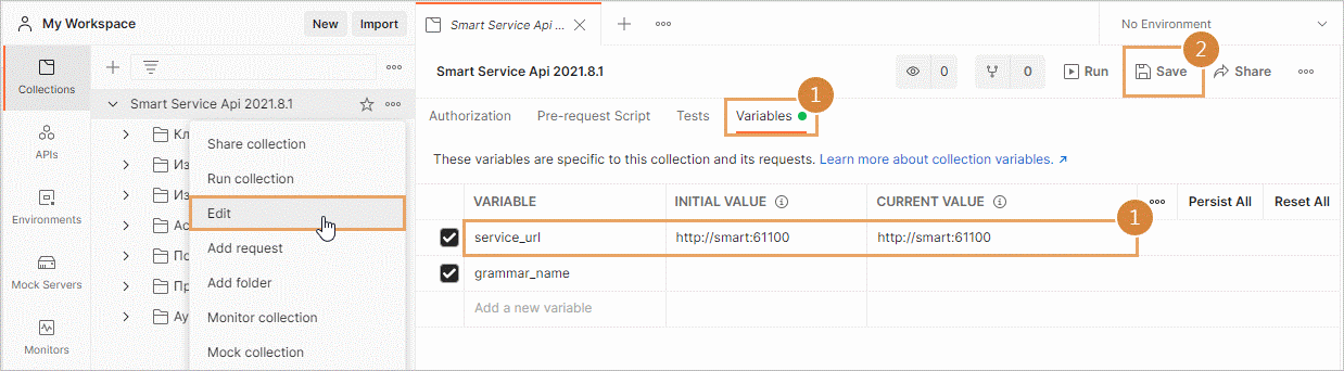 1.В контекстном меню коллекции выберите пункт Edit и на закладке Variables укажите адрес веб-сайта сервиса Smart Service.