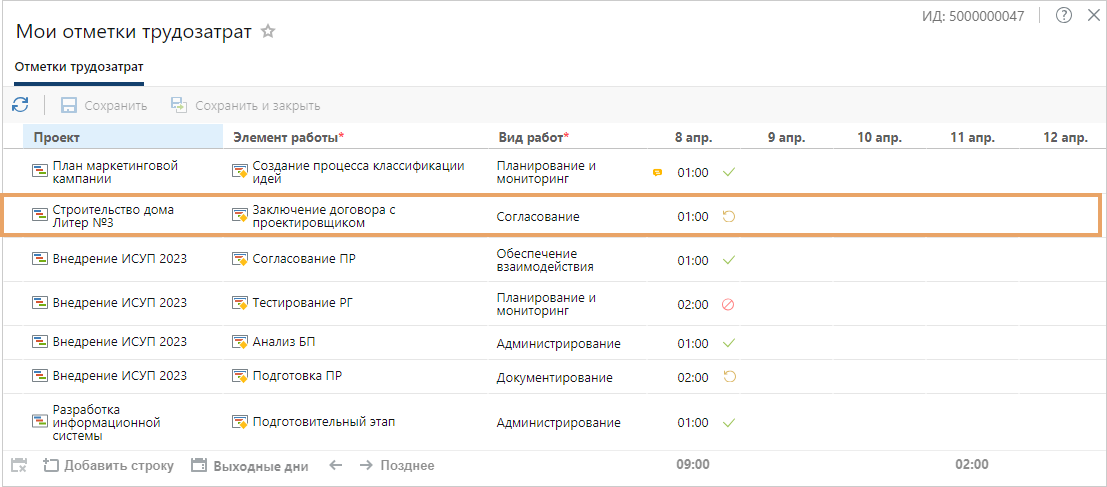 << Click to Display Table of Contents >> Прикладные модули > Планирование проектов > Исполнение работ по плану > Учет фактической трудоемкости и затрат Доработка отметок трудозатрат |